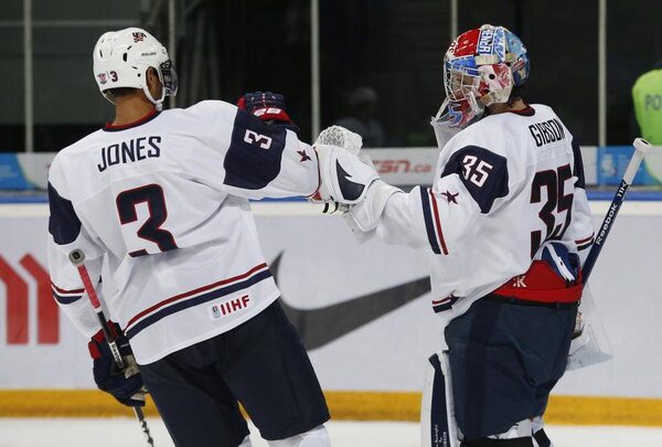 Team USA's goalie John Gibson celebrates with Seth Jones after they defeated the Czech Republic in their quarter-final game at the 2013 IIHF U20 World Junior Hockey Championship in Ufa, January 2, 2013.MARK BLINCH/Reuters