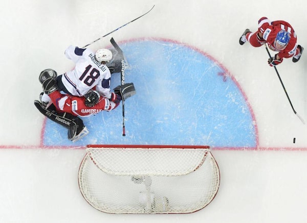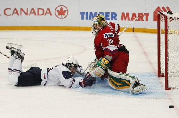 Czech Republic's goalie Patrik Bartosak lets a goal in by Team USA's John Gaudreau (not seen) during the second period of their quarter-final game at the 2013 IIHF U20 World Junior Hockey Championship in Ufa, January 2, 2013.Mark Blinch/The Canadian Press