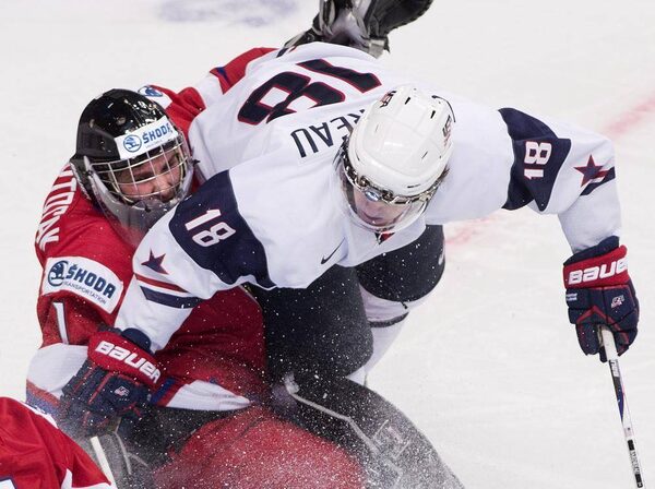 Team USA forward Cole Bardreau (18) runs into Czech Republic goalie Patrik Bartosak, left, during first period quarter-final IIHF World Junior Championships hockey action in Ufa, Russia on Wednesday, Jan. 2, 2013.Nathan Denette/The Canadian Press