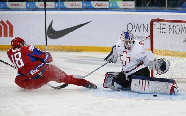Switzerland's goalie Melvin Nyffeler makes a save on Russia's Yaroslav Kosov (L) during the first period of their quarter-final game at the 2013 IIHF U20 World Junior Hockey Championship in Ufa, January 2, 2013.MARK BLINCH/Reuters