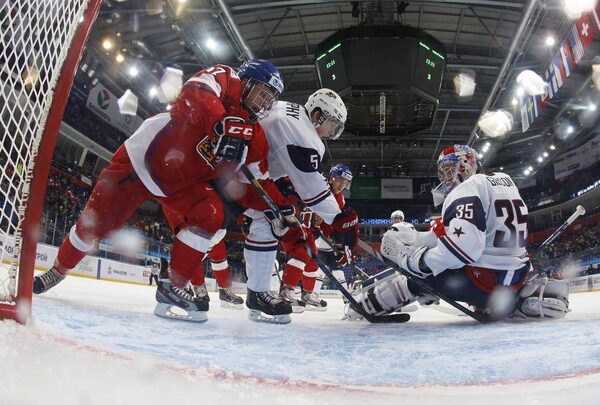 Team USA's goalie John Gibson (R) defends the net with Connor Murphy (C) against Czech Republic's Jan Stencel during the third period of their quarter-final game at the 2013 IIHF U20 World Junior Hockey Championship in Ufa, January 2, 2013.Mark Blinch/The Canadian Press