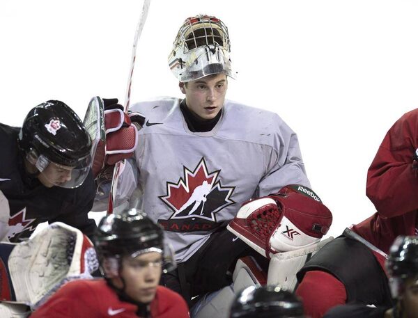 Team Canada goaltender Zachary Fucale keeps an eye on the action at the World Junior Hockey Championship team selection camp in St. Catharines, Ont. on Monday, December 15, 2014.Frank Gunn/The Canadian Press