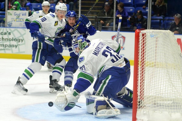Utica Comets goalie Jacob Markstrom blocks a shot as Brendan Gaunce and Toronto Marlies’ Brendan Leipsic watch on Nov. 6. Playing in relative obscurity a few minutes from the Air Canada Centre, the Marlies look like everything the Maple Leafs are not.Tina Russell/The Associated Press