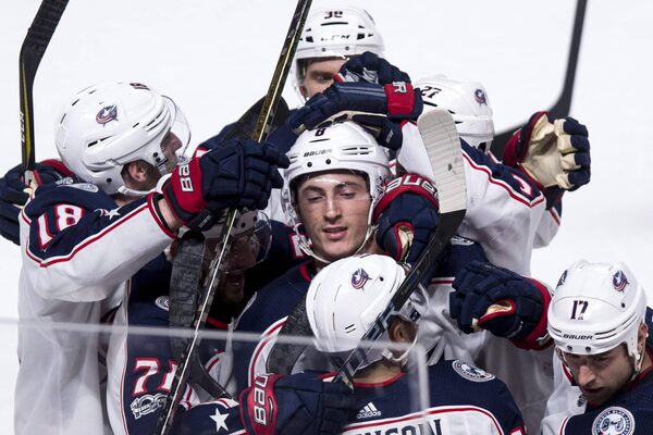 Columbus Blue Jackets' Zach Werenski is surrounded by teammates after scoring the winning goal past Montreal Canadiens goalie Charlie Lindgren during overtime in Montreal, on Nov. 14, 2017.Paul Chiasson/The Canadian Press
