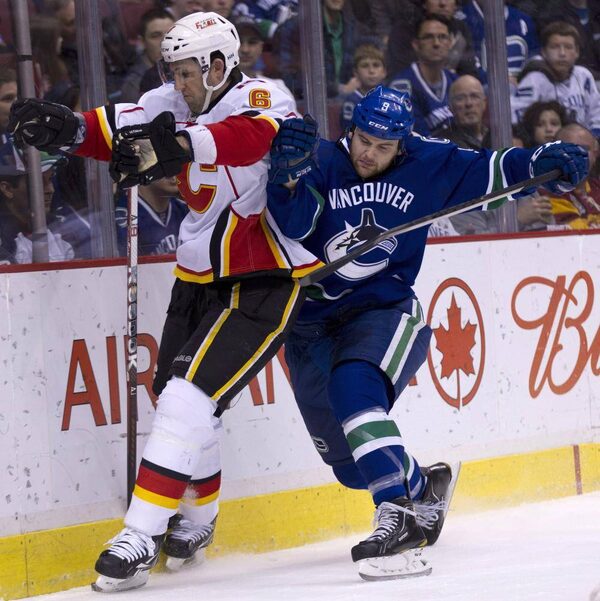 Calgary Flames defenseman Cory Sarich fights for control of the puck with Vancouver Canucks right wing Zack KassianJONATHAN HAYWARD/The Canadian Press