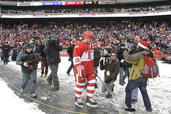 Detroit Red Wings forward Steve Yzerman walks to the ice before the first period of the Winter Classic Alumni outdoor NHL hockey game at Comerica Park in Detroit, Tuesday, Dec. 31, 2013.CARLOS OSORIO/The Associated Press