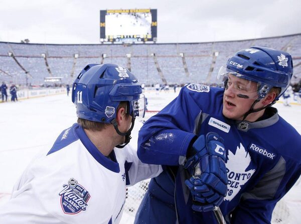 Toronto Maple Leafs centre Jay McClement (11) and defenceman Morgan Rielly (44) collide against the boards during practice the day before the Winter Classic hockey game against the Detroit Red Wings at Michigan Stadium.RICK OSENTOSKI