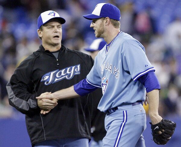 Toronto Blue Jays manager John Gibbons, left, congratulates starter Roy Halladay after pitching a complete game to defeat the Kansas City Royals 7-1 during their American League baseball game against the Kansas City Royals in Toronto on Friday May 23, 2008.J.P. Moczulski/The Canadian Press