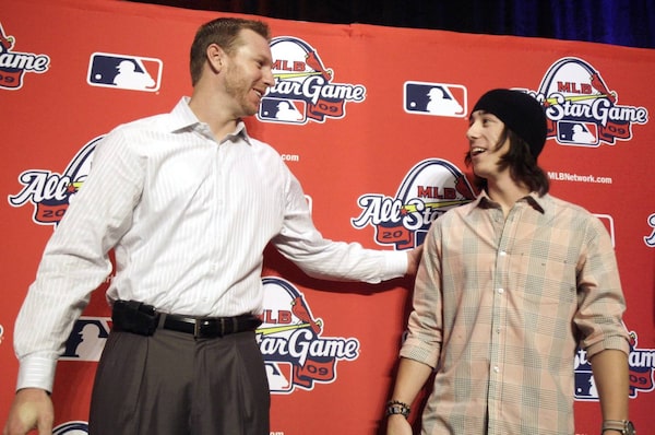American League starting pitcher Roy Halladay, left, of the Toronto Blue Jays, and National League starting pitcher Tim Lincecum, of the San Francisco Giants, talk after a news conference announcing the starting lineups for the All-Star baseball game Monday, July 13, 2009, in St. Louis.Jeff Roberson/The Associated Press