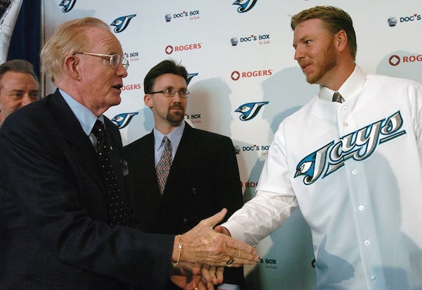 Toronto Blue Jays pitcher Roy Halladay, right, shakes hands with Rogers Communications Inc. president and CEO Ted Rogers after a press conferrence in Toronto Thursday Jan. 22, 2004.Aaron Harris/The Canadian Press