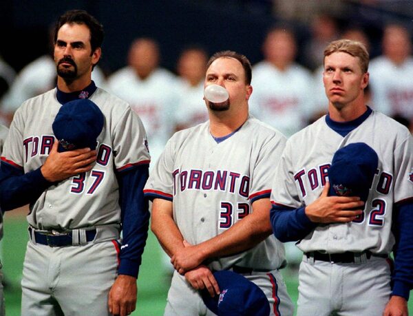 Toronto Blue Jays pitcher David Wells, center, blows a bubble as he and fellow pitchers Graeme Lloyd (37), and Roy Halladay, right, stand for the playing of the Canadian National Anthem following introductions before their game against the Minnesota Twins, Tuesday night, April 6, 1999 in Minneapolis.The Associated Press