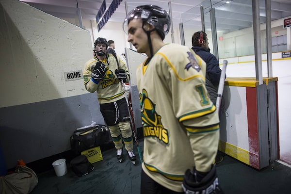 Surrey Knights' Carmine Sorace, back left, and Jackson Kallweit, front, sit in the dressing room before playing against the North Vancouver Wolf Pack in Surrey, B.C.,Darryl Dyck/The Globe and Mail