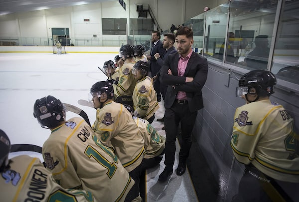 Surrey Knights' head coaches Scott McHaffie, front, his twin brother Spencer McHaffie and assistant coach Spencer Asch-Jones, watch from the bench during the second period against the Aldergrove Kodiaks in Surrey, B.C.Darryl Dyck/The Globe and Mail