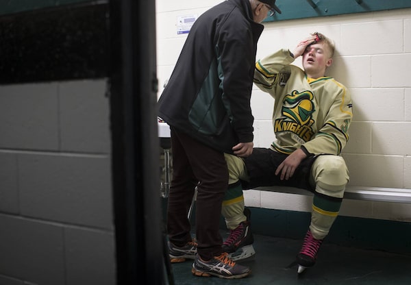 Surrey Knights' Ethan Koskelainem holds a towel to his head as trainer John Chwyl checks on him after he was cut above the eye and injured his wrist when he was checked from behind into the boards by Aldergrove Kodiaks' Dayton Spink during a game in Surrey, B.C. Koskelainem stayed to watch the end of the game before going to a hospital where he received five stitches and was diagnosed with a hyperextended wrist.Darryl Dyck/The Globe and Mail