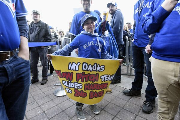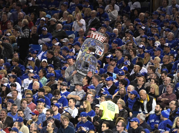A fan holds up a sign during the Toronto Blue Jays home opener against the Boston Red Sox.Fred Lum/The Globe and Mail