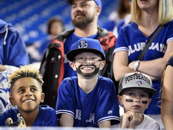 Trying to get the attention of Toronto Blue Jays players during batting practice are from left Carson Reid, 8; Oscar Wood, 9 (wearing a Bautista beard) and his brother Jasper, 7.Fred Lum/The Globe and Mail