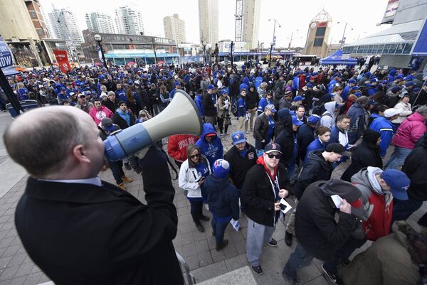 A man addresses fans with a megaphone as they line up before the game.Fred Lum/The Globe and Mail