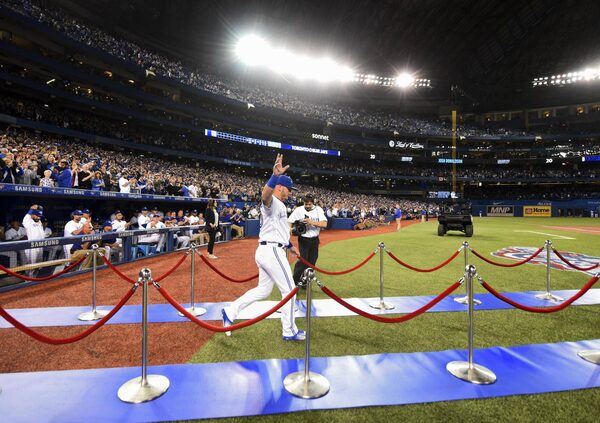Toronto Blue Jays designated hitter Josh Donaldson acknowledges the crowd as he heads out to receive his MVP award prior to the game.Fred Lum/The Globe and Mail