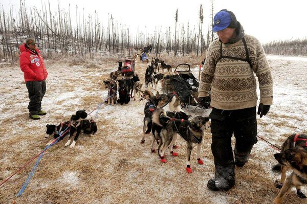 Day 3: Mats Pettersson lines up his dogs as he prepares to continue across the Farewell Burn during the Iditarod Trail Sled Dog Race in Alaska, Tuesday, March 4, 2014. Jake Berkowitz, left, who busted up his sled beyond repair, looks on.Bob Hallinen/The Associated Press