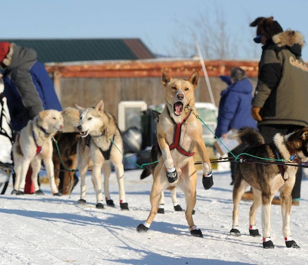 Day 7: One of Hans Gatt’s dogs is ready to go as Gatt made a brief stop at the Yukon River village of Kaltag during the 2014 Iditarod Trail Sled Dog Race on Saturday, March 8, 2014.Bob Hallinen/The Associated Press