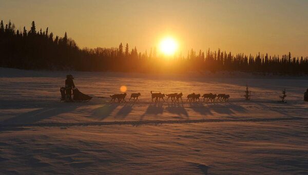 Day 6: Richie Diehl, from Aniak, Alaska, mushes down the Yukon River at sunset after leaving the Ruby checkpoint during the 2014 Iditarod Trail Sled Dog Race on Friday, March 7, 2014.Bob Hallinen/The Associated Press