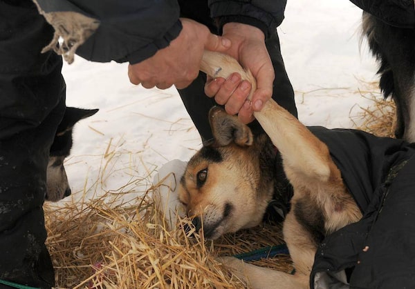 Day 4: Nathan Schroeder, from Chisholm, Minn., rubs ointment into one of his dogs’ legs at the Takotna, Alaska, checkpoint during the Iditarod Trail Sled Dog Race on Wednesday, March 5, 2014.Bob Hallinen/The Associated Press
