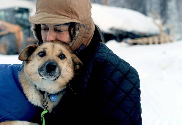 Day 5: Musher Karin Hendrickson cuddles with one of her sled dogs at the Takotna checkpoint during the Iditarod Trail Sled Dog Race on Thursday, March 6, 2014.Bob Hallinen/The Associated Press