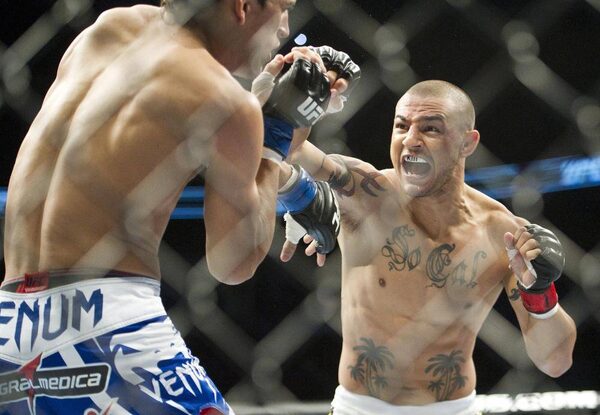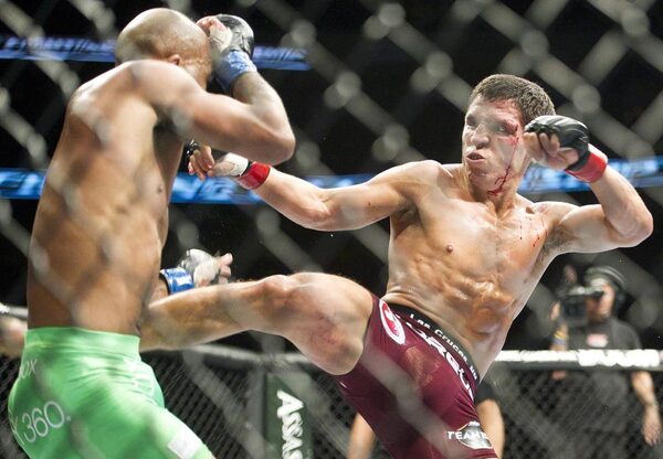 Cub Swanson, left, bttles against Charles Oliveira during the featherweight bout at UFC 152 in Toronto on Saturday, Sept. 22, 2012.Nathan Denette/The Canadian Press