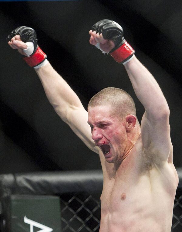 Mitch Gagnon, of Canada, reacts after defeating Walel Watson during the bantamweight bout at UFC 152 in Toronto on Saturday, Sept. 22, 2012.Nathan Denette/The Canadian Press