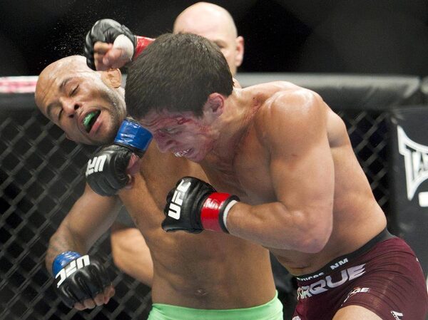 Joseph Benavidez, right, throws punch on Demetrious Johnson during the flyweight championship title bout at UFC 152 in Toronto on Saturday, Sept. 22, 2012.Nathan Denette/The Canadian Press