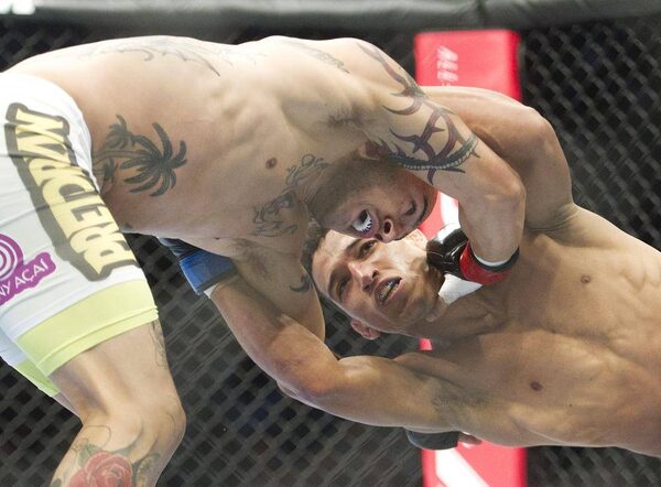 Cub Swanson, left, battles against Charles Oliveira during the featherweight bout at UFC 152 in Toronto on Saturday, Sept. 22, 2012.Nathan Denette/The Canadian Press