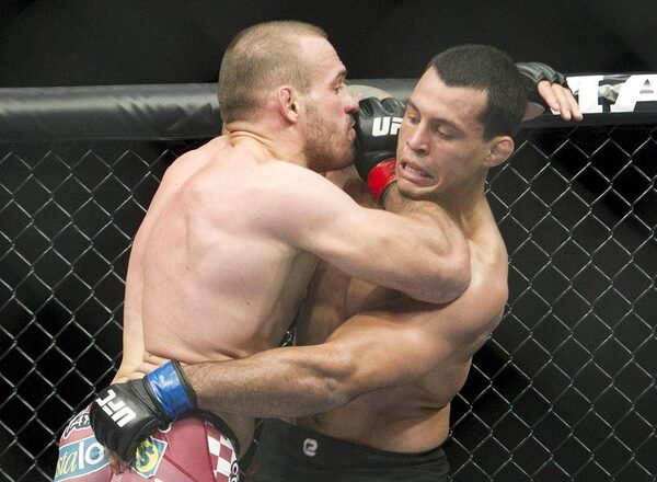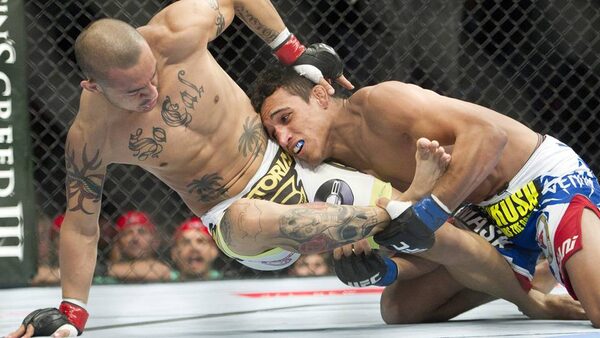 Cub Swanson, left, battles against Charles Oliveira during the featherweight bout at UFC 152 in Toronto on Saturday, Sept. 22, 2012.