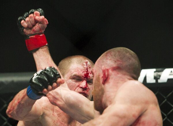Marcus Brimage, left, punches Jimy Hettes during the welterweight bout at UFC 152 in Toronto on Saturday, Sept. 22, 2012.Nathan Denette/The Canadian Press