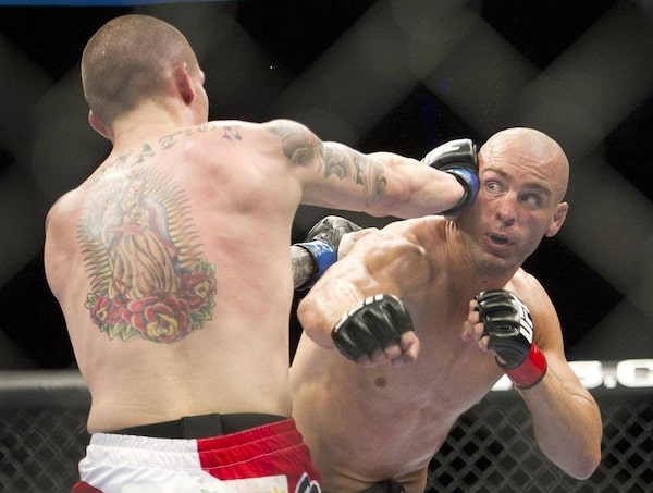 Seth Baczynski, left, fights Simeon Thoresen during the featherweight bout at UFC 152 in Toronto on Saturday, Sept. 22, 2012.Nathan Denette/The Canadian Press