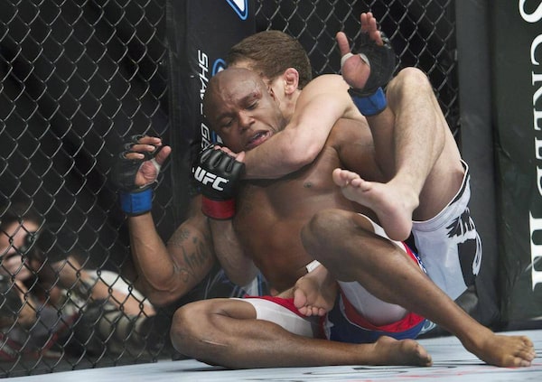 Marcus Brimage, front, gets choked by Jimy Hettes during the welterweight bout at UFC 152 in Toronto on Saturday, Sept. 22, 2012.Nathan Denette/The Canadian Press