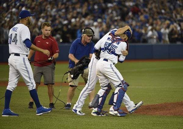 Toronto Blue Jays catcher Russell Martin (55)gets pat on the head after the Toronto Blue Jays beat the New York Yankees 4-0 at the Rogers Centre.Fred Lum/The Globe and Mail