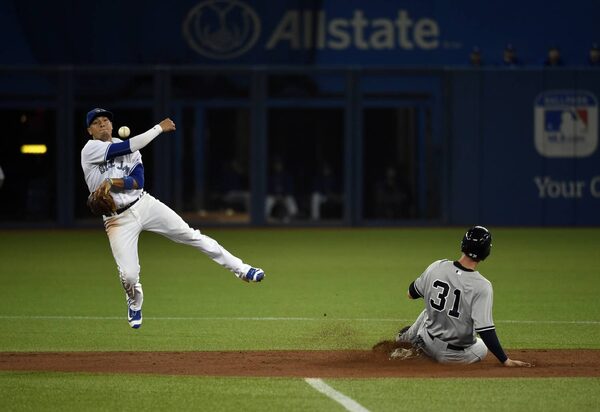 Toronto Blue Jays second baseman Ryan Goins throws to first base as New York Yankees first baseman Greg Bird slides into second.Fred Lum/The Globe and Mail