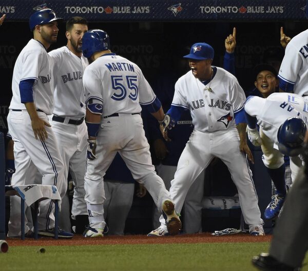 Toronto Blue Jays pitcher Marcus Stroman (RIGHT) is pumped up as he greets catcher Russell Martin in the Jays dugout after Martin stroked a three run homer to give the Jays a 4-0 lead in their game against the New York Yankees at the Rogers Centre.Fred Lum/The Globe and Mail