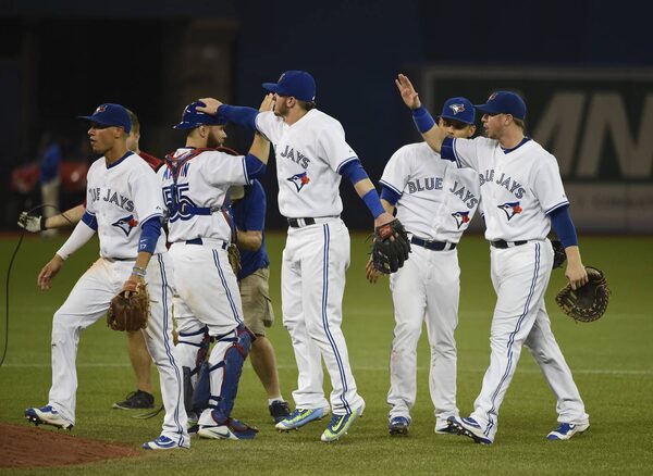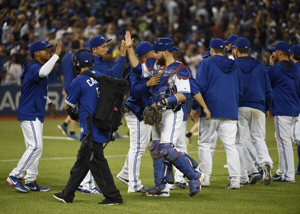 The Toronto Blue Jays celebrate their 4-0 win over the New York Yankees at the Rogers Centre.Fred Lum/The Globe and Mail