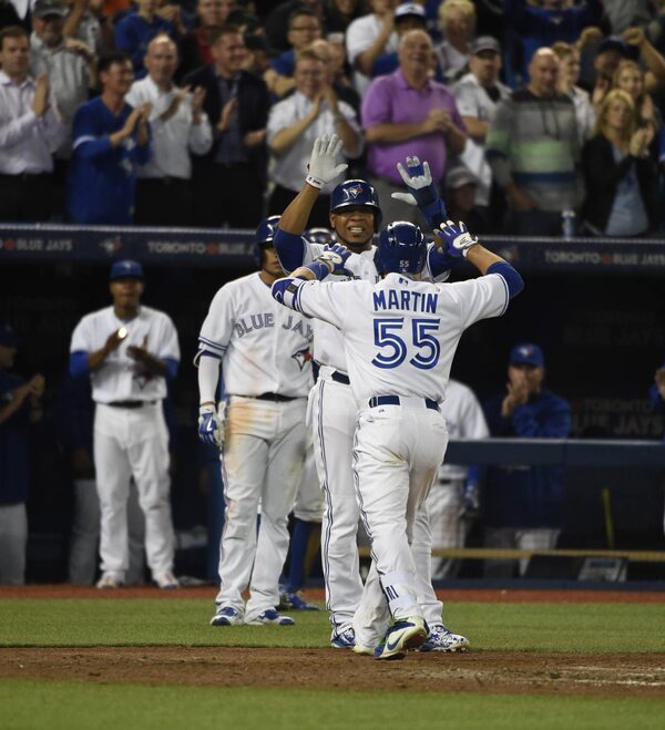 Toronto Blue Jays catcher Russell Martin gets hugged by Toronto Blue Jays left fielder Chris Colabello after the Jays beat the New York Yankees 4-0 at the Rogers Centre.Fred Lum/The Globe and Mail