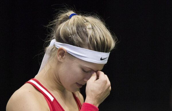 Canada's Eugenie Bouchard reacts during her Federal Cup tennis match against Romania's Alexandra Dulgheru in Montreal, Saturday, April 18, 2015.Graham Hughes/The Canadian Press
