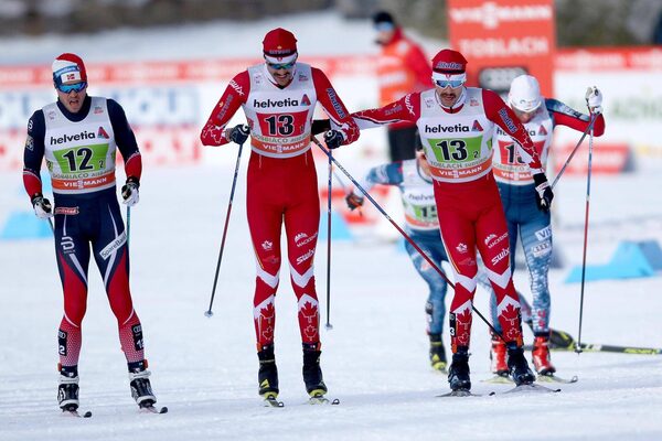 Alex Harvey, right, and Len Valjas, center, ski on their way to win the men's team sprint competition of the FIS Cross Country Skiing World Cup in Dobbiaco (Toblach), Italy, Sunday, Jan. 15, 2017.Andrea Solero/The Associated Press
