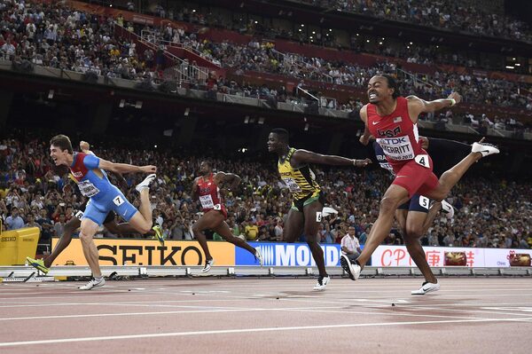 Russia’s Sergey Shubenkov, second left, dips for the line to win ahead of Jamaica’s Hansle Parchment, left, and Aries Merritt of the United States, right in the final of the men’s 110 metres hurdles in Beijing on Aug. 28.FRANCK FIFE/AFP / Getty Images