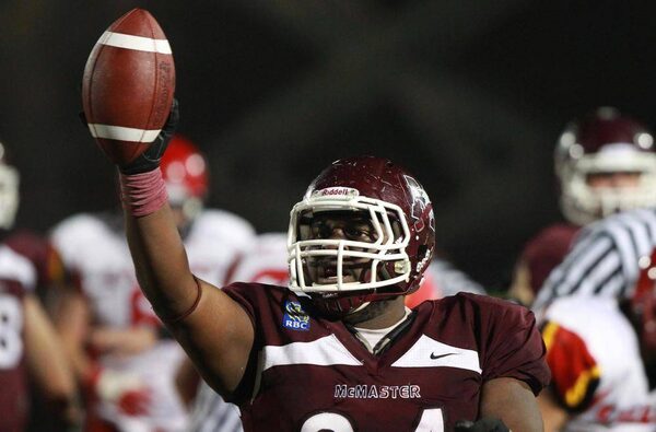 McMaster University Marauders' Kevin Malcolm celebrates after recovering a University of Calgary Dinos fumble during third quarter CIS Mitchell Bowl football action in Hamilton, Ontario, on Saturday, Nov. 17, 2012.Dave Chidley/The Canadian Press