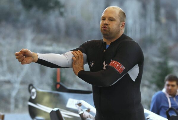 Steve Holcomb reacts after finishing his run during the United States two-man bobsled team trials on Oct. 20, 2015.Jim Urquhart/The Associated Press