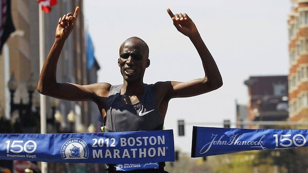 Wesley Korir of Kenya breaks the tape to win the men's division of the 116th Boston Marathon in Boston, Massachusetts April 16, 2012.BRIAN SNYDER
