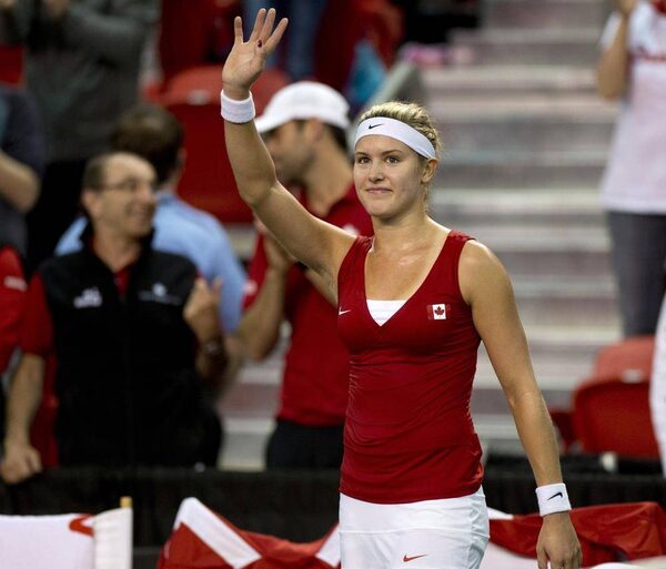 Eugenie Bouchard, of Canada, celebrates her win over Kristina Kucova, of Slovakia, during the second match at the Fed Cup tennis tournament Saturday, April 19, 2014 at Laval University in Quebec City.Jacques Boissinot/The Canadian Press