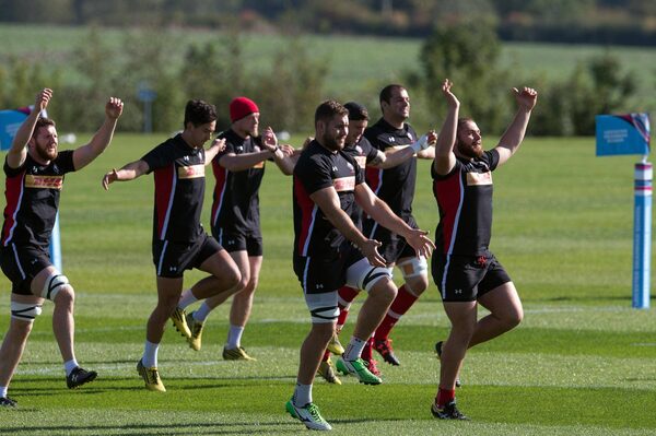 The Canadian men’s national rugby team warms up during a training session in Leicester on Sept. 28. Canada is in the midst of playing three games in 11 days.BERTRAND LANGLOIS/AFP / Getty Images