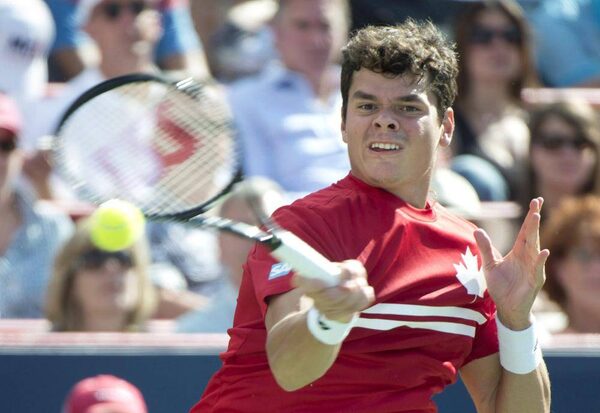 Canada's Milos Raonic returns to Rafael Nadal from Spain during the final at the Rogers Cup tennis tournament in MontrealPaul Chiasson/The Canadian Press