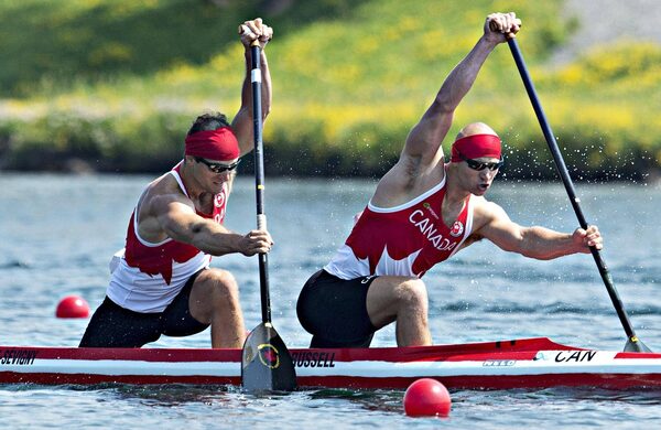 Canada's Gabriel Beauchesne-Sevigny, left, and Benjamin Russell paddle their way to a gold medal in the men's C2 1,000-metre canoe race at the 2015 Pan Am Games in Welland, Ont., on July 13.Aaron Lynett/The Canadian Press